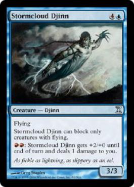 | Text (eng) Flying Stormcloud Djinn can block only creatures with flying. {R}{R}: Stormcloud Djinn gets +2/+0 until end of turn and deals 1 damage to you. | |