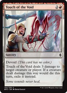 Text (eng) Devoid (This card has no color.) Touch of the Void deals 3 damage to target creature or player. If a creature dealt damage this way would die this turn, exile it instead. | |