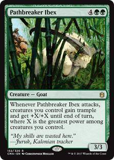 Text (eng) Whenever Pathbreaker Ibex attacks, creatures you control gain trample and get +X/+X until end of turn, where X is the greatest power among creatures you control. |