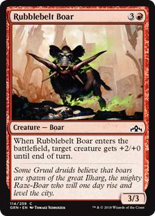 | Text (eng) When Rubblebelt Boar enters the battlefield, target creature gets +2/+0 until end of turn. | |