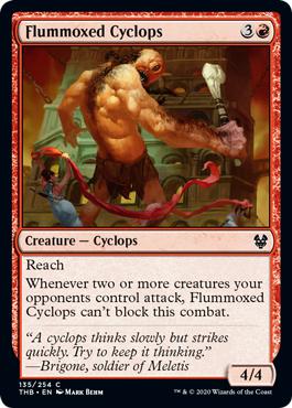 | Text (eng) Reach Whenever two or more creatures your opponents control attack, Flummoxed Cyclops cant block this combat. | |