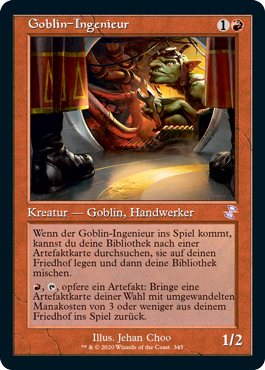 | Text (eng) When Goblin Engineer enters the battlefield, you may search your library for an artifact card, put it into your graveyard, then shuffle your library. R, TAP, Sacrifice an artifact: Return target artifact card with converted mana cost 3 or less from your graveyard to the battlefield. | |
