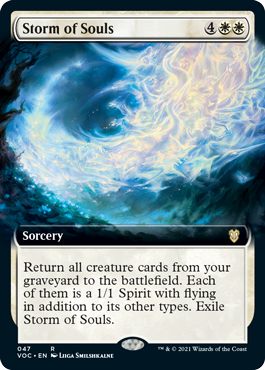 Text (eng) Return all creature cards from your graveyard to the battlefield. Each of them is a 1/1 Spirit with flying in addition to its other types. Exile Storm of Souls. |