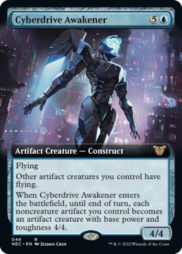 | Text (eng) Flying Other artifact creatures you control have flying. When Cyberdrive Awakener enters the battlefield, until end of turn, each noncreature artifact you control becomes an artifact creature with base power and toughness 4/4. | |