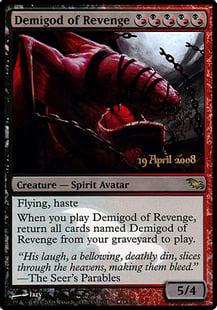 Text (eng) When you cast this spell, return all cards named Demigod of Revenge from your graveyard to the battlefield. Flying, haste |