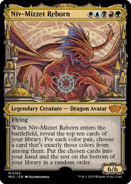 | Text (eng) Flying When Niv-Mizzet Reborn enters the battlefield, reveal the top ten cards of your library. For each color pair, choose a card thats exactly those colors from among them. Put the chosen cards into your hand and the rest on the bottom of your library in a random order. | |