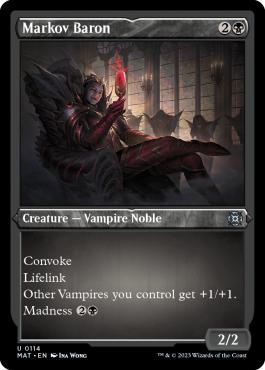 Text (eng) Convoke (Your creatures can help cast this spell. Each creature you tap while casting this spell pays for 1 or one mana of that creatures color.) Lifelink Other Vampires you control get +1/+1. Madness 2B (If you discard this card, discard it into exile. When you do, cast it for its madness cost or put it into your graveyard.) |