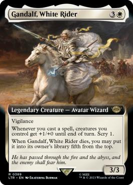 | Text (eng) Vigilance Whenever you cast a spell, creatures you control get +1/+0 until end of turn. Scry 1. When Gandalf, White Rider dies, you may put it into its owners library fifth from the top. | |