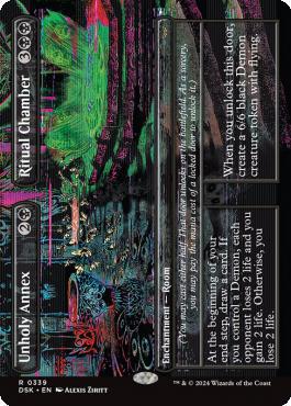 Text (eng) Unholy Annex Enchantment - Room (You may cast either half. That door unlocks on the battlefield. As a sorcery, you may pay the mana cost of a locked door to unlock it.) At the beginning of your end step, draw a card. If you control a Demon, each opponent loses 2 life and you gain 2 life. Otherwise, you lose 2 life. Ritual Chamber Enchantment - Room (You may cast either half. That door unlocks on the battlefield. As a sorcery, you may pay the mana cost of a locked door to unlock it.) When you unlock this door, create a 6/6 black Demon creature token with flying. |