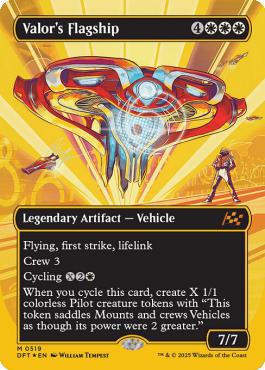 | Text (eng) Flying, first strike, lifelink Crew 3 Cycling X2W (X2W, Discard this card: Draw a card.) When you cycle this card, create X 1/1 colorless Pilot creature tokens with »This token saddles Mounts and crews Vehicles as though its power were 2 greater.« | |