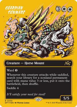 | Text (eng) Ward 2 Whenever this creature attacks while saddled, search your library for a nonland permanent card with mana value 3 or less, put it onto the battlefield, then shuffle. Saddle 4 | |