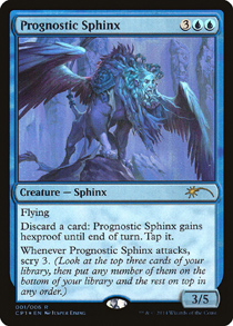 | Text (eng) Flying Discard a card: Prognostic Sphinx gains hexproof until end of turn. Tap it. Whenever Prognostic Sphinx attacks, scry 3. | |
