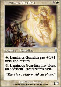 | Text | W: Luminous Guardian gets +0/+1 until end of turn. 2: Luminous Guardian may block an additional creature this turn. | |